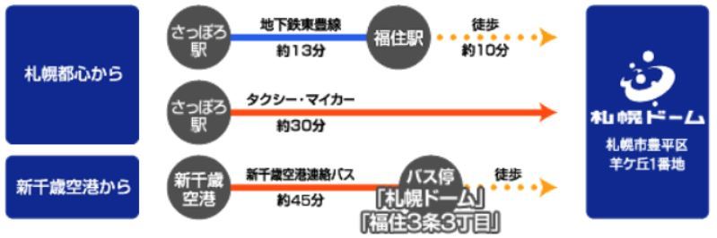 《さっぽろ駅ー(地下鉄東豊線/約13分)ー福住駅ー(徒歩/約10分)ー札幌ドーム》