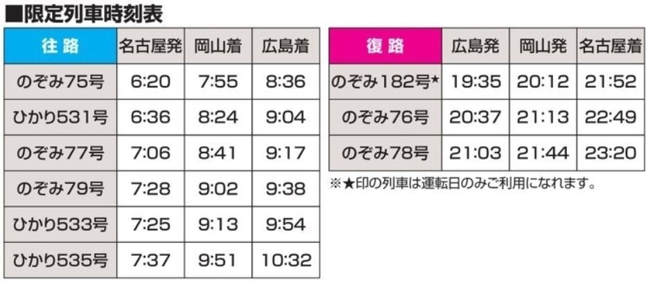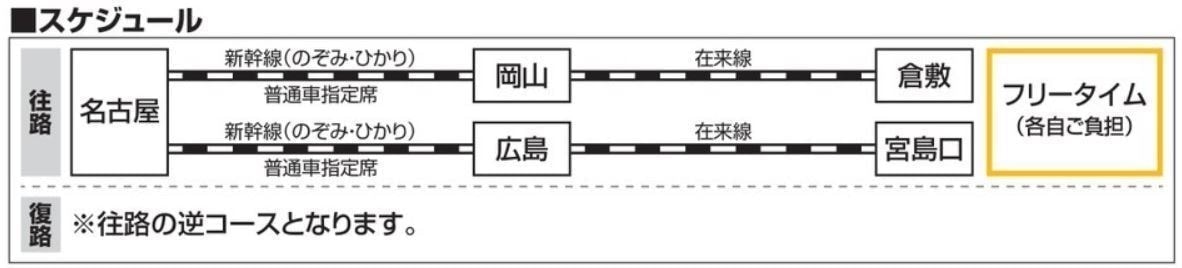 | 料金目安 | 16,400円(名古屋駅発着/往復限定のぞみ号・ひかり号普通車指定席利用・大人お一人様基本料金) |