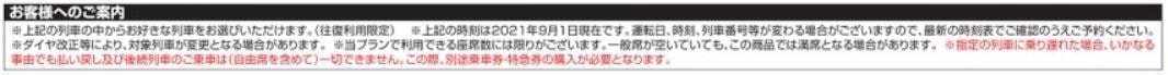 | 代金に含まれるもの | 往復JR代・消費税等諸税 |