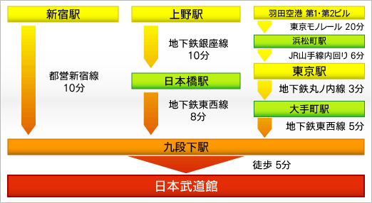 《新線新宿駅ー(都営新宿線/約8分)ー九段下駅ー(徒歩/約5分)ー日本武道館》