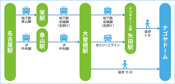 《地下鉄金山駅ー(地下鉄名城線栄・大曽根方面/約20分)ーナゴヤドーム前矢田駅ー(徒歩/約5分)ーナゴヤドーム》
