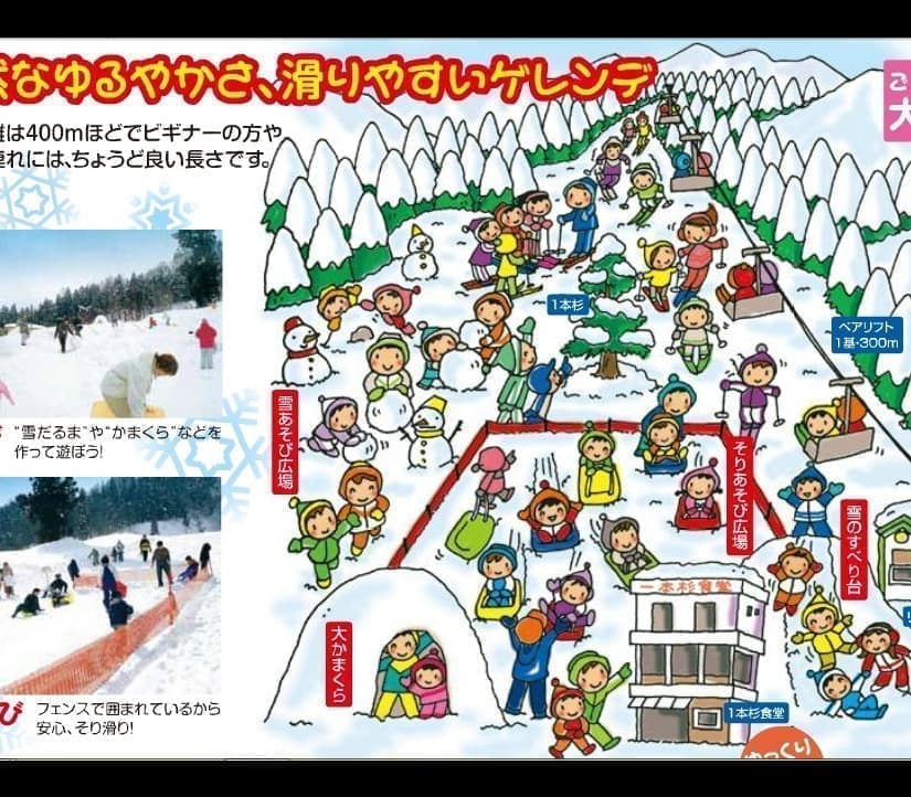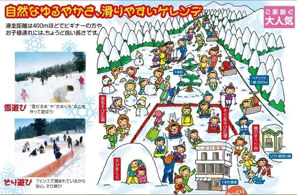 JR越後湯沢駅から徒歩3分で滑走距離400mのファミリー、キッズ向けのスキー場。フラットな部分の多いゲレンデは、スキー初心者やちびっこの雪遊びに最適です。雪遊び広場やそり遊びのスペース、雪でできたすべり台や大かまくらなどが設置され、子どもたちも元気いっぱい雪で遊ぶことができます。
