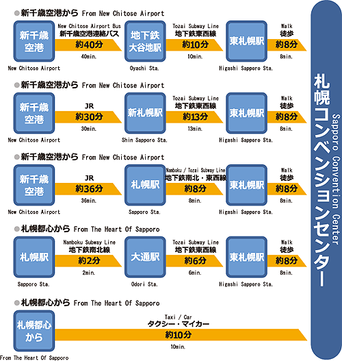 《新千歳空港駅ー(JR千歳線快速エアポート/約28分)ー新さっぽろ駅ー(地下鉄東西線/約14分)ー東札幌駅ー(徒歩/約6分)ー札幌コンベンションセンター》