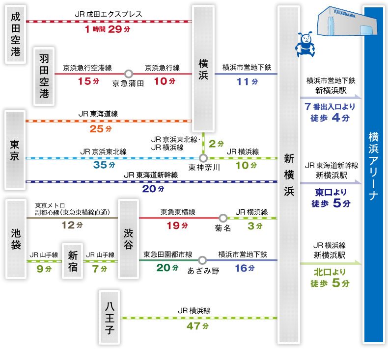 《JR東京駅ー(JR東海道本線/約25分)ー横浜駅ー(JR横浜線/約13分)ー新横浜駅ー(徒歩/約5分)ー横浜アリーナ》