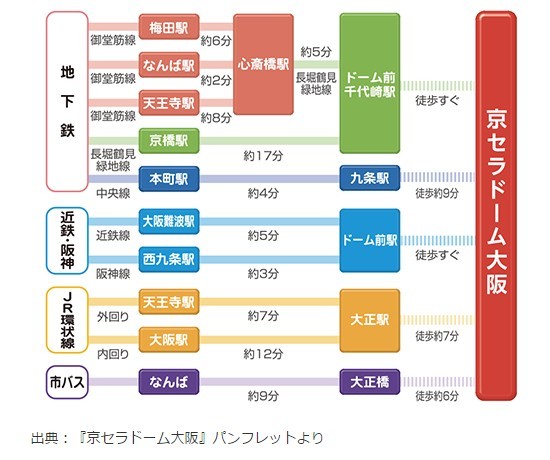 《地下鉄御堂筋線梅田駅ー(地下鉄御堂筋線/約6分)ー心斎橋駅ー(地下鉄長堀鶴見緑地線/約5分)ードーム前千代崎駅ー(徒歩すぐ)ー京セラドーム大阪》