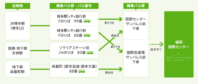 《地下鉄天神駅ー(地下鉄空港線/約1分)ー中洲川端駅ー(地下鉄箱崎線/約1分)ー呉服町駅ー(徒歩/約12分)ー福岡国際会議場》