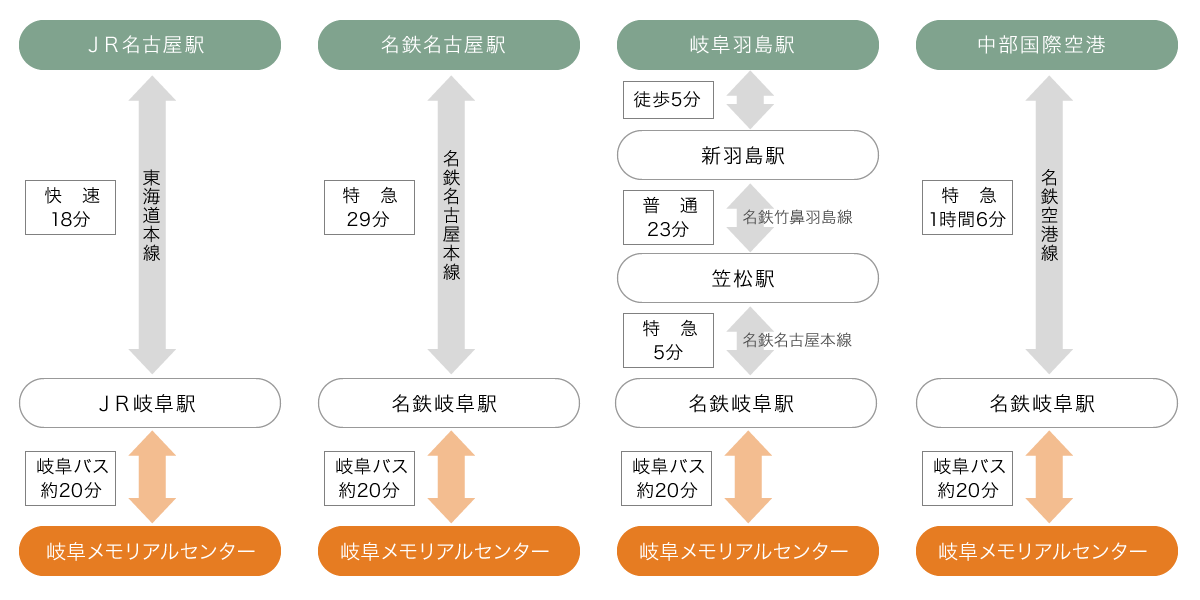 ●中部国際空港駅より名鉄線空港特急で約65分、名鉄岐阜駅下車。名鉄岐阜バスターミナルから路線バスで岐阜メモリアルセンター前まで約20分