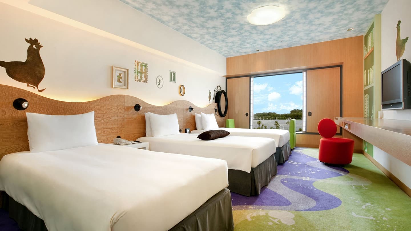 モダンで洗練された客室は、鮮やかなリーフグリーンや明るいブルーパープルを基調にしています。天井には爽やかな青空と白い雲、壁面には愛らしい動物達のイラストが 描かれ、アーティスティックな印象。