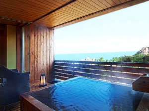 ■源泉露天風呂付客室源泉を豊富に配湯した、海を見渡す眺望の檜露天風呂付客室。縦横140cmのおおきな浴槽とウッドデッキで檜づくしの独立した広い空間の露天風呂が配置されております。檜の香と湯の香をお楽しみください。 |