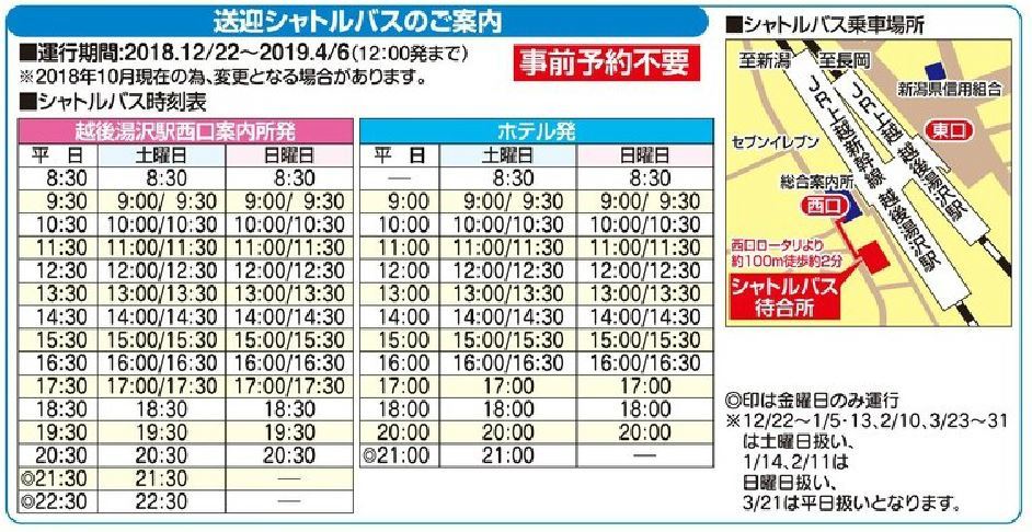 - ●GALA湯沢・湯沢中里・湯沢パーク・湯沢高原・NASPAの各スキー場へ送迎バスを運行予定※詳しくはホテルへお問い合せ下さい。